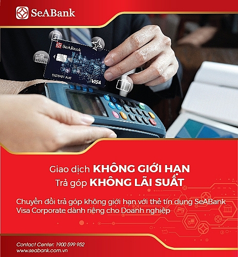 Theo đó, SeABank áp dụng chính sách trả góp lãi suất 0%, kỳ hạn linh hoạt tùy chọn từ 3 đến 12 tháng cho giao dịch thanh toán bằng thẻ tín dụng dành riêng cho doanh nghiệp - SeABank Visa Corporate. Với mức phí cạnh tranh, thủ tục đơn giản, nhanh chóng và đặc biệt không giới hạn giao dịch trả góp, đây chắc chắn là giải pháp tài chính hữu hiệu cho doanh nghiệp khi cần gấp vốn lưu động và bổ sung nguồn vốn trong thời gian sớm nhất.