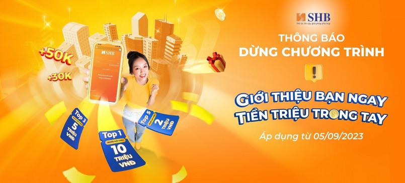 Nhằm gia tăng lợi ích cho khách hàng, Ngân hàng Sài Gòn – Hà Nội (SHB) trân trọng thông báo dừng chương trình “Giới thiệu bạn ngay – Tiền triệu trao tay” từ ngày 05/09/2023 để chuẩn bị ra mắt một chương trình mới hấp dẫn với nhiều giải thưởng giá trị hơn.
