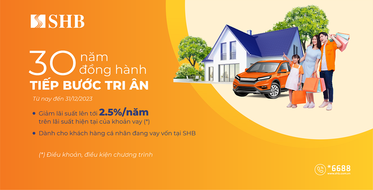 Thấu hiểu nhu cầu sử dụng vốn vào mùa cao điểm cuối năm, từ nay đến 31/12/2023, Ngân hàng Sài Gòn - Hà Nội (SHB) triển khai chương trình “30 năm đồng hành – Tiếp bước tri ân” ưu đãi lãi suất vay hấp dẫn dành cho các khách hàng cá nhân (KHCN). Tổng hạn mức ưu đãi lên đến 5.000 tỷ đồng.