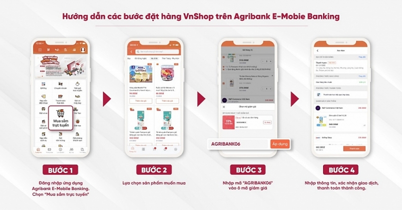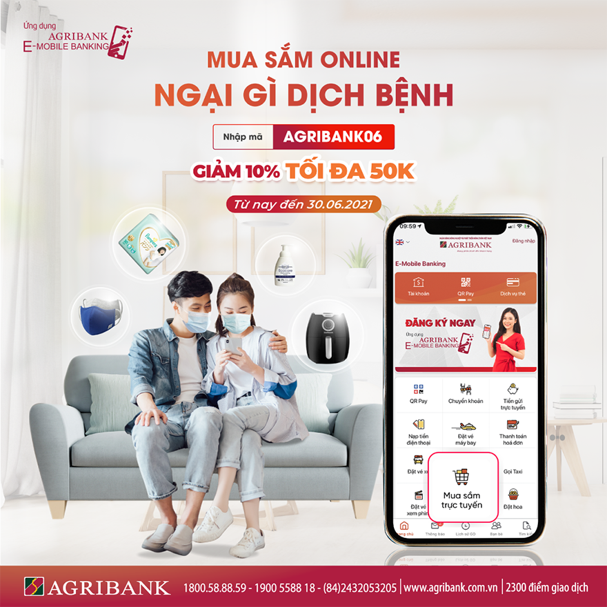 Theo đó, từ nay đến hết ngày 30/6/2021, quý khách hàng nhập mã “AGRIBANK06” sẽ được giảm ngay 10% (tối đa 50.000 VND) giá trị đơn hàng khi mua hàng qua tiện ích mua sắm trực tuyến tại chợ điện tử Vnshop trên ứng dụng Agribank E-Mobile Banking để lựa chọn các sản phẩm phù hợp trong số hàng ngàn mặt hàng từ điện tử gia dụng, mẹ và bé, thời trang, phụ kiện, mỹ phẩm, làm đẹp… một cách, đơn giản, nhanh gọn, an toàn, tiết kiệm chỉ cần ngồi nhà chờ đợi hàng giao tận nơi.