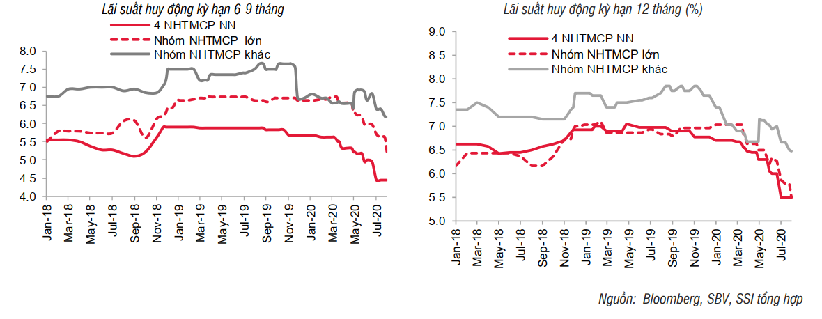 SSI Research cho biết, trong 7 tháng đầu năm, mặt bằng lãi suất tiền gửi đã hạ xuống thấp hơn từ 1 - 2 điểm % so với cuối năm 2019 ở phần lớn các NHTM. Tính bình quân, lãi tiền gửi đã giảm 0,7 - 0,9 điểm % ở kì hạn dưới 12 tháng và giảm khoảng 1 điểm % ở các kì hạn trên 1 năm so với mức bình quân năm 2019.