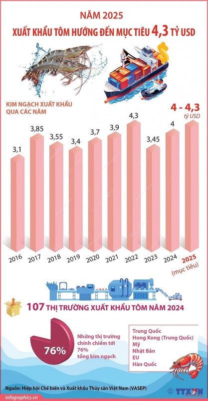 Theo Hiệp hội Chế biến và xuất khẩu thủy sản Việt Nam (VASEP), xuất khẩu tôm của Việt Nam năm nay đặt mục tiêu đạt kim ngạch xuất khẩu 4 - 4,3 tỷ USD.