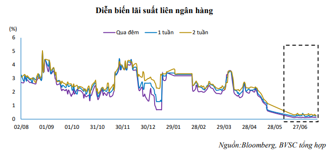 Với việc thanh khoản hệ thống ngân hàng tiếp tục duy trì ở trạng thái dồi dào (thể hiện qua mặt bằng lãi suất liên ngân hàng ở mức thấp), BVSC cho rằng nhiều khả năng NHNN chưa phải có động thái can thiệp mạnh nhằm hỗ trợ thanh khoản cho hệ thống.