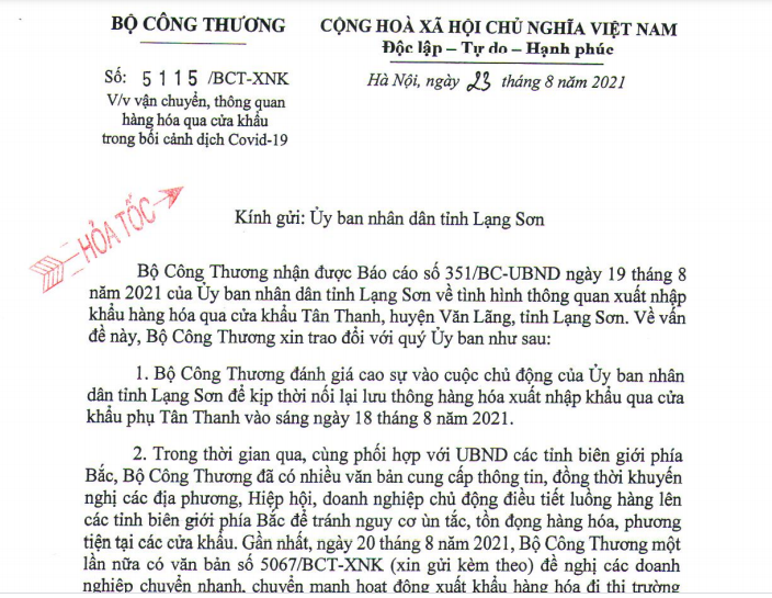 Ngày 23/8/2021 Thứ trưởng Bộ Công Thương Trần Quốc Khánh đã ký Công văn số 5115/BCT-XNK gửi UBND tỉnh Lạng Sơn đề nghị phối hợp, chỉ đạo các cơ quan, lực lượng chức năng trên địa bàn triển khai các biện pháp cấp bách tạo điều kiện thuận lợi cho vận chuyển, thông quan hàng hóa qua cửa khẩu trong bối cảnh dịch Covid-19.
