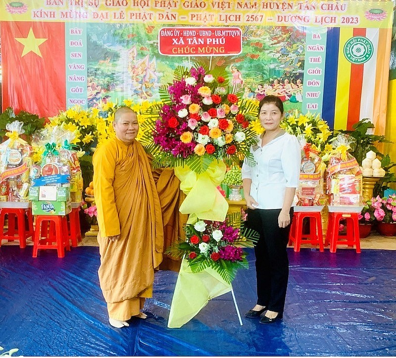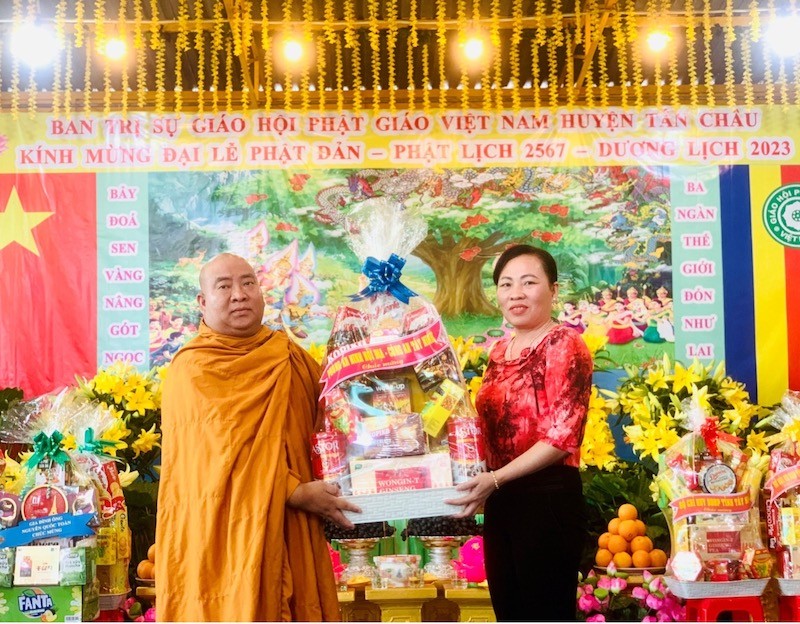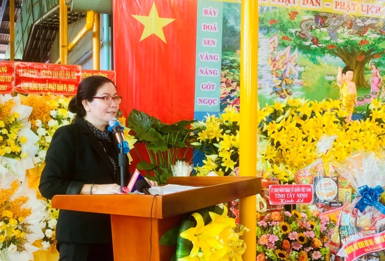 Bà Nguyễn Thị Phượng - Phó Chủ tịch UBND huyện Tân Châu thay mặt Chính quyền các cấp chúc mừng Đại lễ Phật Đản của BTS GHPGVN huyện Tân Châu và ghi nhận sự đóng góp của Tăng Ni Phật tử huyện Tân Châu trong thời gian qua. Bà Phó Chủ tịch cũng mong muốn BTS và Tăng Ni Phật tử huyện Tân Châu tiếp tục phát huy tinh thần tương thân tương ái góp phần an sinh xã hội. |