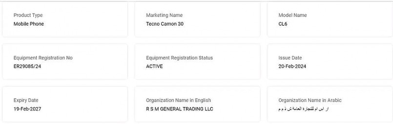 Camon 30 đã được chứng nhận TDRA của UAE. Smartphone này dường như là chiếc điện thoại thông minh 4G LTE phiên bản rẻ nhất trong dòng sản phẩm và mang số model CL6. Thiết bị tương tự này cũng đã được phát hiện trên nền tảng FCC, điều này đã xác nhận máy hỗ trợ 4G LTE. Chứng nhận cũng liệt kê sản phẩm có viên pin 5.000mAh.