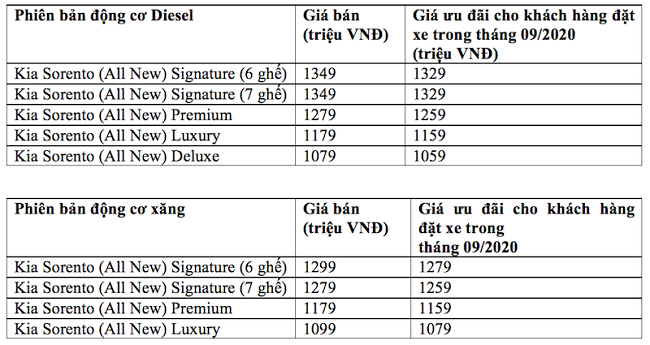 Bảng giá các phiên bản áp dụng từ ngày 15-9-2020