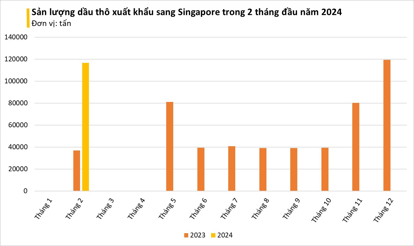 Cụ thể, Việt Nam xuất sang Singapore 116.797 tấn dầu thô trong tháng 2/2024, thu về hơn 81,3 triệu USD, tăng đột biến 216% về lượng và tăng 204% về trị giá so với cùng kỳ năm 2023. Giá xuất khẩu đạt 696,5 USD/tấn, giảm 3,7% so với cùng kỳ năm 2023. Đây cũng là tháng đầu tiên thị trường này thực hiện nhập khẩu dầu thô từ Việt Nam trong năm.