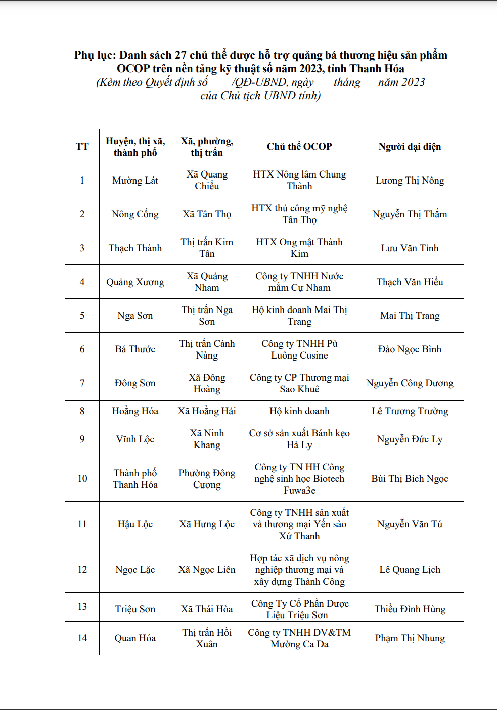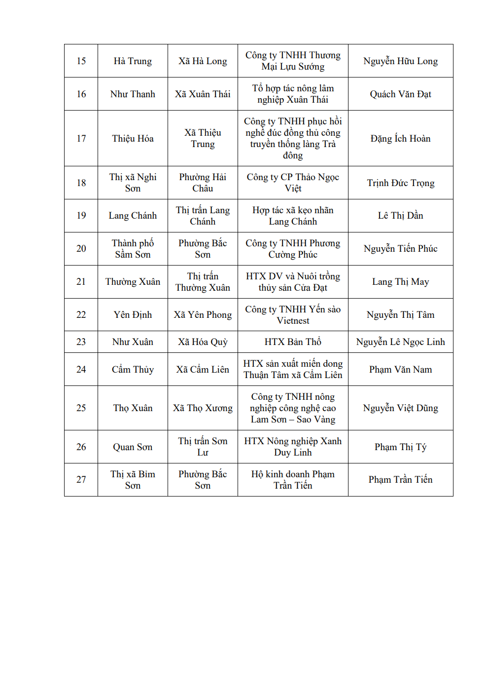27 chủ thể được phê duyệt hỗ trợ quảng bá thương hiệu sản phẩm OCOP đến từ các HTX, công ty, cơ sở sản xuất, hộ kinh doanh trên địa bàn tỉnh Thanh Hóa.