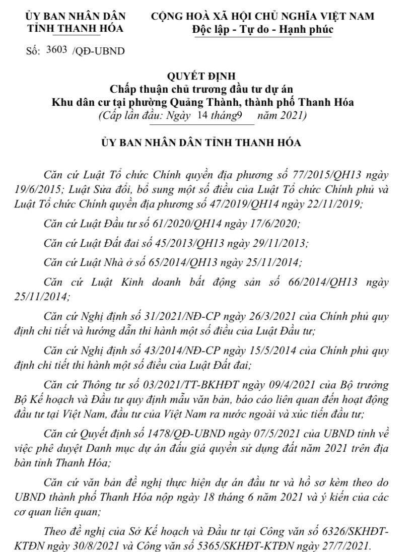 Ngày 14/9/2021 UBND tỉnh Thanh Hóa đã có Quyết định số 3603/QĐ-UBND về việc chấp thuận chủ trương đầu tư dự án Khu dân cư tại phường Quảng Thành, thành phố Thanh Hóa.