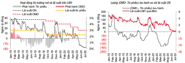 Theo thông tin từ Tổng cục Thống kê, tăng trưởng huy động đến 19/6 là 4,35% so với cuối năm trước, cao gần gấp đôi tăng trưởng tín dụng tại cùng thời điểm. NHNN duy trì nới lỏng thông qua 147.000 tỷ đồng đã bơm ra thông qua tín phiếu đáo hạn và chênh lệch huy động – cho vay nới rộng khiến thanh khoản các NHTM ở mức dư thừa. Lãi suất trên liên ngân hàng đã giảm 1,6-3,4%/năm so với 2019 và nhiều khả năng sẽ đi ngang ở vùng thấp lịch sử.
