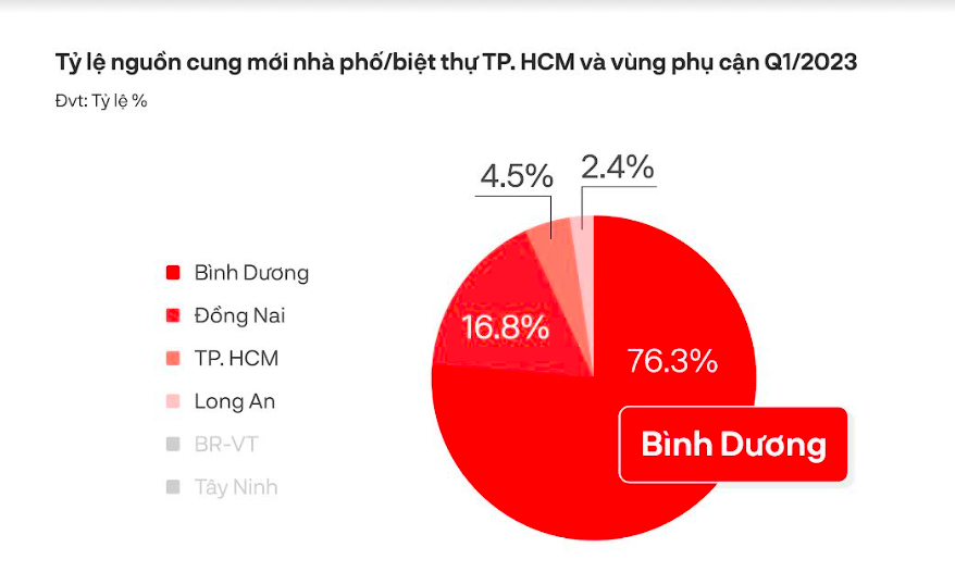 Nguồn cung mới nhà phố/biệt thự khu vực TP.HCM và vùng phụ cận, trong 3 tháng đầu năm 2023, đón nhận 375 căn mở bán đến từ 9 dự án, giảm 39% so quý I/2022. Nguồn cung mới tập trung chủ yếu tại Bình Dương.