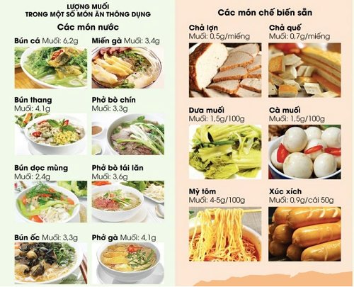 Theo PGS.TS Lê Bạch Mai, nguyên Phó viện trưởng Viện Dinh dưỡng Quốc gia, nếu bạn ăn một bát phở bò tái chín, lượng muối trong đó đủ cung cấp cho cơ thể trong một ngày, với khoảng trên 3,34g muối. Hay như trong bát phở bò sốt vang cung cấp gần 483 kcal, chứa tới 4,6g muối.