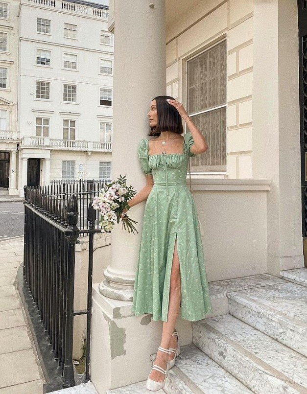 10. Váy đi dự tiệc cưới dễ thương, sự góp mặt của chiếc đầm midi xẻ tà cuốn hút
