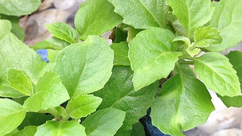 Lá của cây khá dày, giòn, màu xanh đậm ở mặt trên, màu xanh nhạt ở mặt dưới, và các gân cũng đều màu xanh, lá có chiều dài từ 3 – 8cm, chiều rộng từ 1.5 – 3.5cm, hình răng ở mép, cuống dài tầm khoảng 1cm.