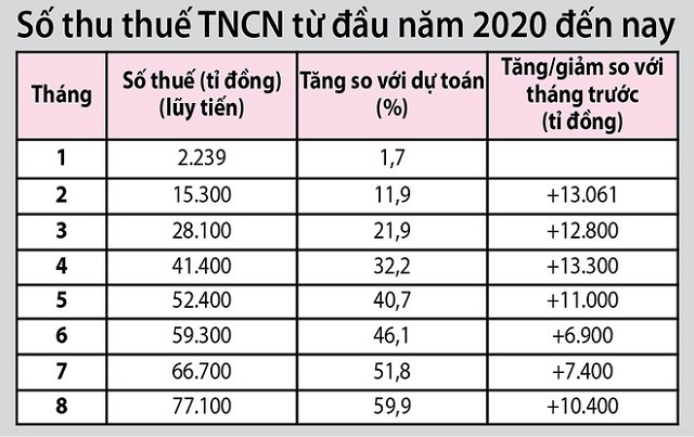 Theo số liệu từ Tổng cục Thống kê, số thu thuế thu nhập cá nhân (TNCN) 8 tháng năm 2020 lên 77.100 tỷ đồng, tăng 10.400 tỷ đồng so với tháng 7; số thu 7 tháng đạt 66.700 tỷ đồng, tăng 7.400 tỷ đồng so với tháng 6. Mức tăng mạnh số thu thuế TNCN trong tháng 7 và 8 gây bất ngờ bởi số thu của các tháng trước đó đang tăng chậm lại, đặc biệt tháng 6 ghi nhận số thu tăng chậm nhất kể từ đầu năm đạt 6.900 tỷ đồng, 6 tháng đạt 59.300 tỷ đồng.