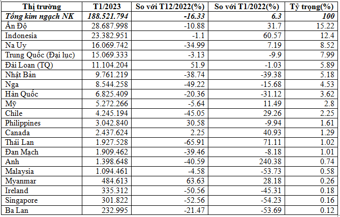 Ấn Độ, Na Uy, Indonesia, Trung Quốc và Đài Loan là các thị trường chủ yếu cung cấp thủy sản cho Việt Nam; trong đó nhập khẩu từ Ấn Độ dẫn đầu về kim ngạch, đạt 28,69 triệu USD, chiếm 15,2% trong tổng kim ngạch nhập khẩu nhập khẩu nhóm hàng này của cả nước, giảm 10,9% so với tháng 12/2022 nhưng tăng 31,7% so với tháng 1/2022.
