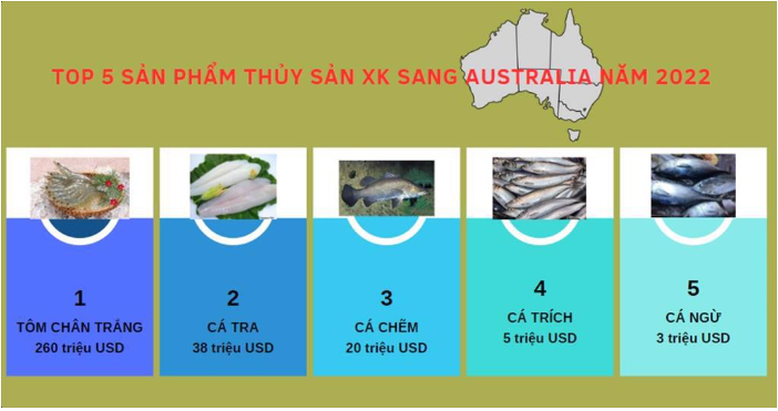 Riêng lĩnh vực thủy sản, Việt Nam đang giữ vị trí số 1 trên thị trường Australia, chiếm 23% nhập khẩu thủy sản của Austria năm 2022. Tỷ trọng này cao hơn rất nhiều so với con số 13% cách đây 5 năm, cho thấy sự bứt phá mạnh mẽ của hàng thủy sản Việt Nam sang Australia nhờ mối quan hệ hợp tác thương mại tốt đẹp và các hiệp định FTA với thị trường này gồm AANZFTA, CPTPP và RCEP. Đặc biệt, sau Hiệp định CPTPP, các sản phẩm thủy sản như tôm, cá tra, hải sản của Việt Nam nhập khẩu vào Australia đều được hưởng mức thuế 0%.