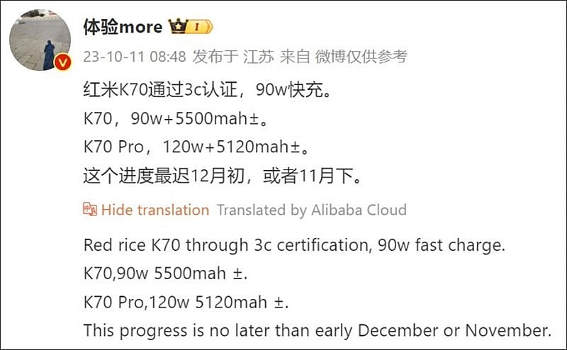 Redmi K70 series cũng được cho là sẽ ra mắt vào cuối tháng 11 giống như rò rỉ trước đó.