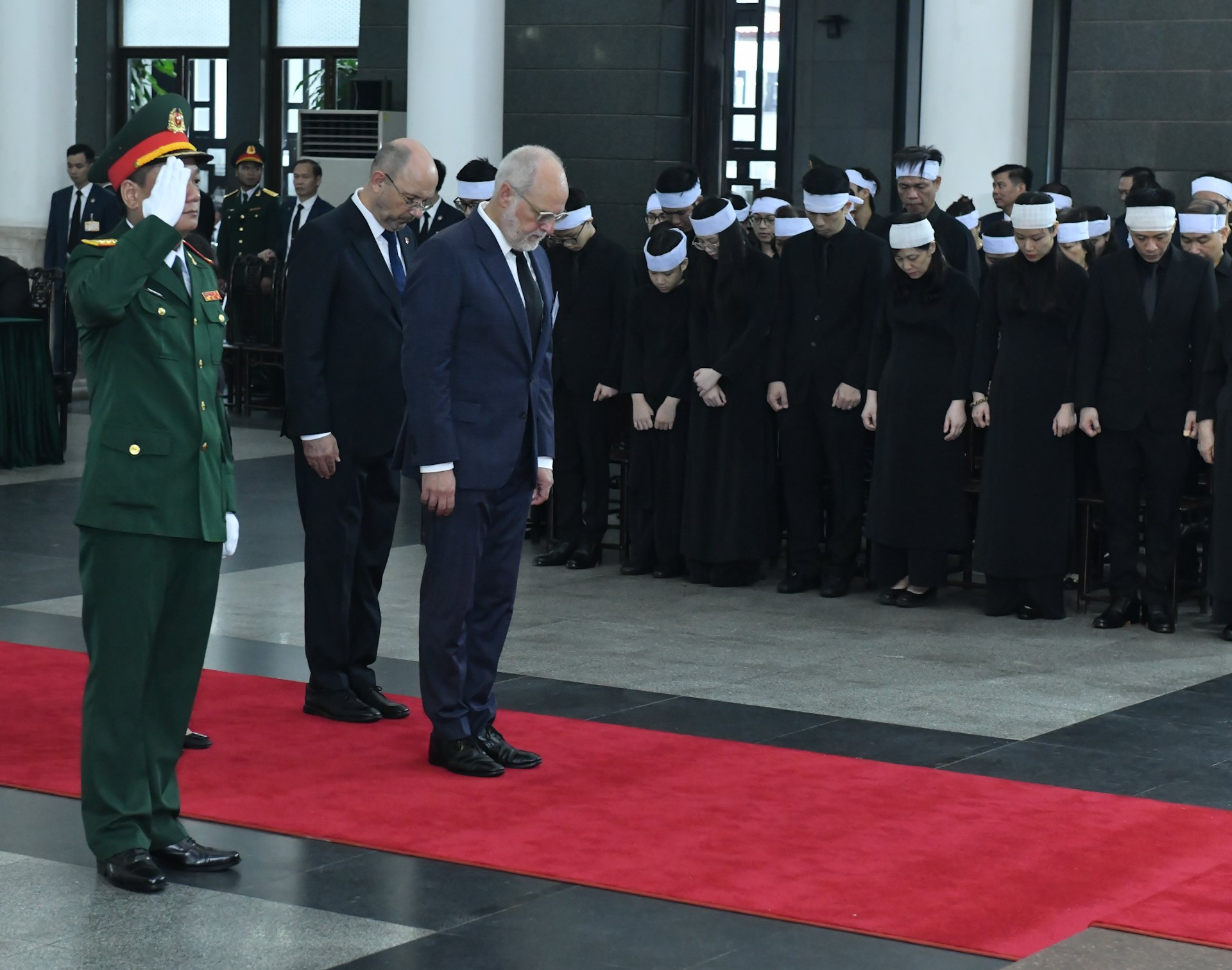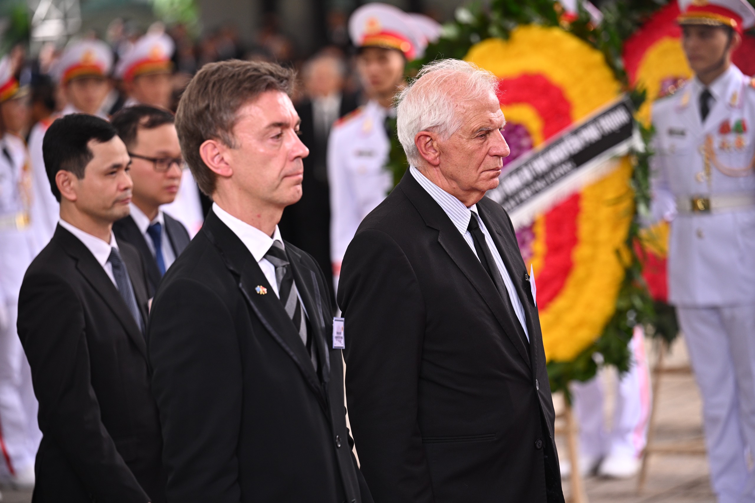 8h47: Đoàn Liên minh Châu Âu do ông Josep Borrell, Phó Chủ tịch Uỷ ban Châu Âu, Đại diện cấp cao về chính sách đối ngoại và an ninh vào kính viếng Tổng Bí thư Nguyễn Phú Trọng