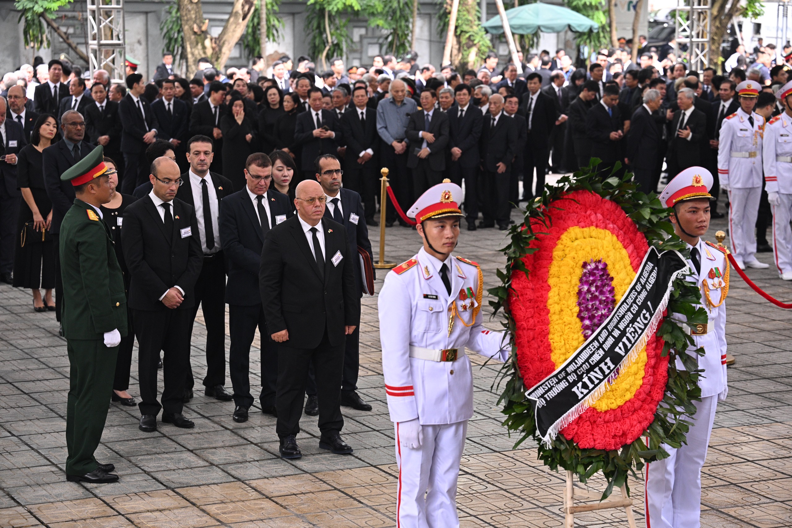 8h05: Đoàn Cộng hòa Algeria Dân chủ và Nhân dân do ngài Laid Rebiga, Bộ trưởng Cựu chiến binh và Người có công Algeria làm Trưởng đoàn vào viếng Tổng Bí thư Nguyễn Phú Trọng.