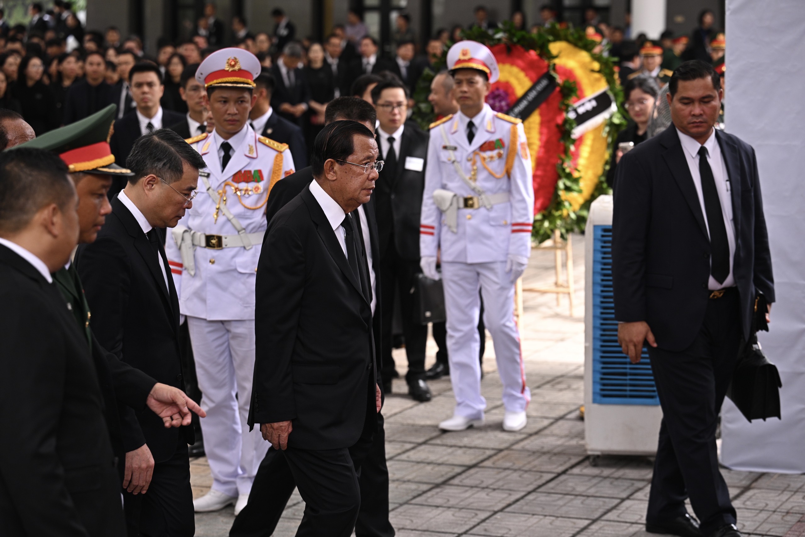 9h46: Đoàn đại biểu Campuchia do Chủ tịch Đảng Nhân dân Campuchia, Chủ tịch Thượng viện Campuchia Hun Sen làm Trưởng đoàn.