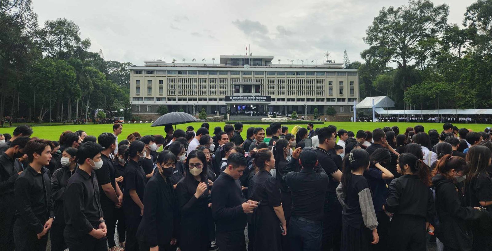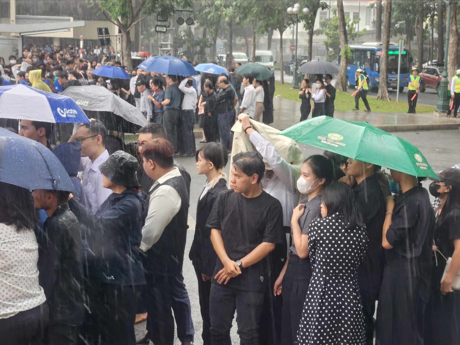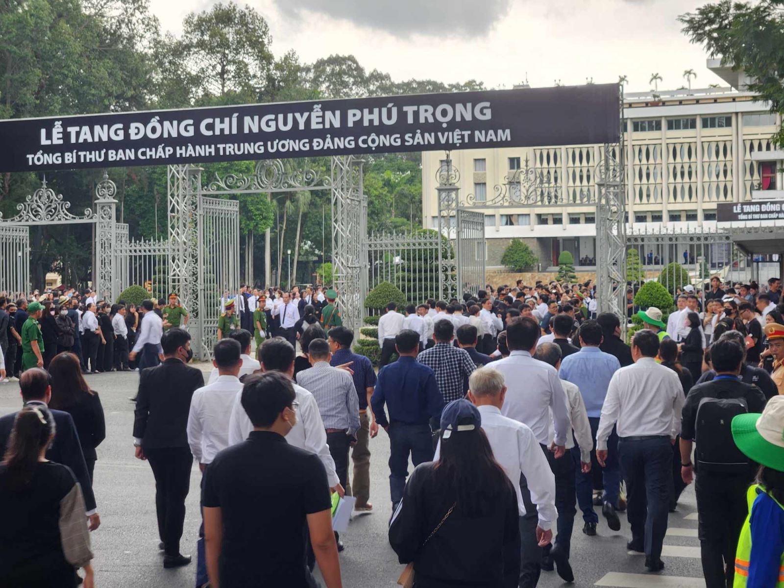Chiều 25/7, dù tiết trời Thành phố Hồ Chí Minh liên tục có mưa to, nhưng người dân và các đoàn đại biểu từ các tỉnh, thành phía Nam vẫn đổ về Hội trường Thống Nhất để vào viếng Tổng Bí thư Nguyễn Phú Trọng.
