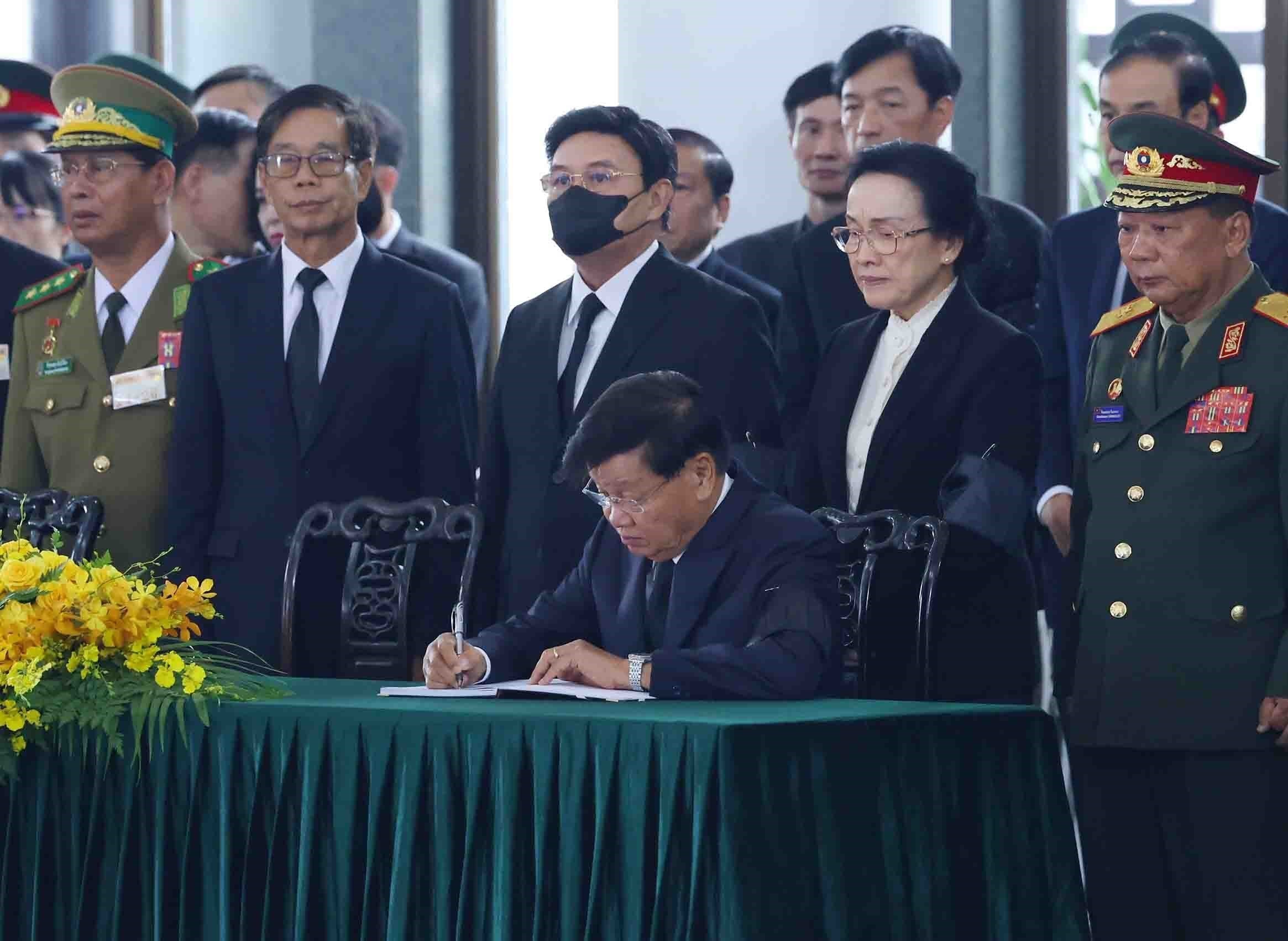 Tổng Bí thư, Chủ tịch nước Lào Thongloun Sisoulith và Phu nhân cùng Đoàn đại biểu cấp cao Đảng, Nhà nước Lào viếng Tổng Bí thư Nguyễn Phú Trọng và ghi sổ tang. Ảnh: TTXVN