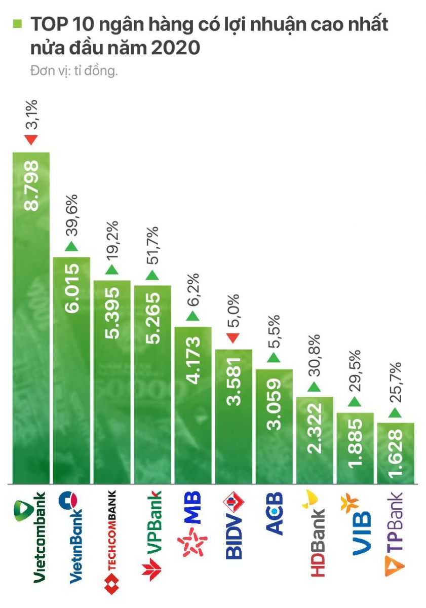 TOP 10 ngân hàng có lợi nhuận cao nhất tính đến hết tháng 6/2020