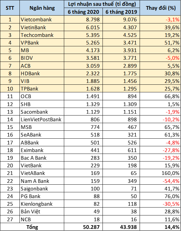 Cũng như các năm trước, Vietcombank vẫn là ngân hàng dẫn đầu về lợi nhuận toàn ngành ngân hàng. Tuy nhiên, so với sự cách biệt gần gấp đôi ngân hàng đứng liền sau của năm 2019, khoảng cách này đã được thu ngắn lại khi lợi nhuận Vietcombank tăng trưởng âm gần 3% trong 6 tháng đầu năm nay. Trong khi, VietinBank đã vượt qua Techcombank, trở thành ngân hàng có lợi nhuận cao thứ hai hệ thống.