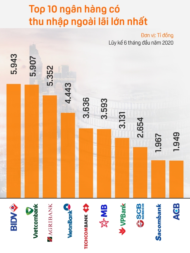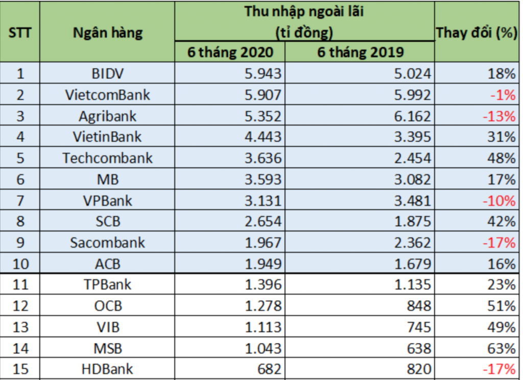Top 10 ngân hàng có thu nhập ngoài lãi lớn nhất gồm BIDV, Vietcombank, Agribank, VietinBank, Techcombank, MB, VPBank, SCB, Sacombank và ACB. Số liệu được thống kê từ báo cáo tài chính của 29 ngân hàng trong nước, tổng thu nhập ngoài lãi nửa đầu năm 2020 đạt 47.902 tỉ đồng, tăng 14% so với cùng kì năm trước. Đồng thời, tỉ trọng thu nhập ngoài lãi trên tổng thu nhập hoạt động (TOI) cũng tăng từ mức 23,1% trong 6 tháng 2019 lên 24,2%.