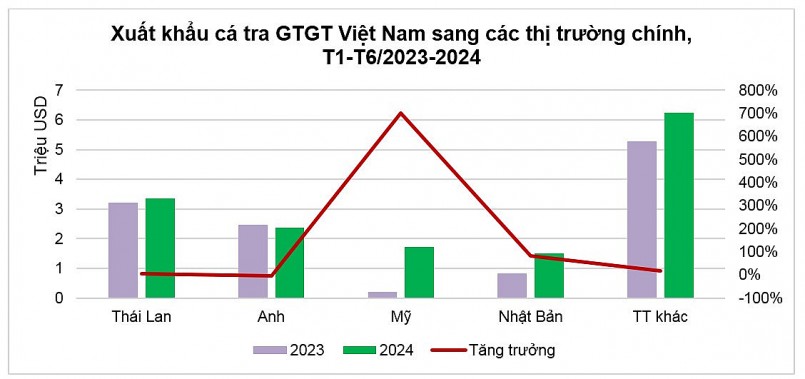 Trong đó, tháng 3/2024 ghi nhận là tháng xuất khẩu cá tra giá trị gia tăng sang Thái Lan đạt giá trị cao nhất, với hơn 800 nghìn USD, tăng 86% so với cùng kỳ năm 2023. Sau khi tăng gấp rưỡi vào tháng 4/2024, thị trường này không nhập khẩu cá tra giá trị gia tăng từ Việt Nam trong tháng 5/2024. Tuy nhiên, tháng 6/2024 Thái Lan tăng nhập khẩu trở lại, gấp đôi so với cùng kỳ năm ngoái, và đạt hơn 700 nghìn USD.