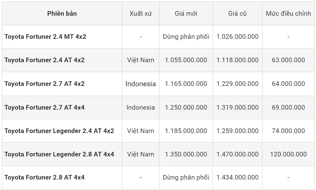 Bảng giá mới của Toyota Fortuner 2024 (đơn vị: đồng)