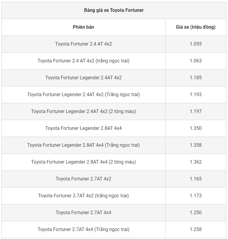 Ngoài số tiền mà khách hàng phải bỏ ra để mua xe Toyota Fortuner thì sẽ còn một số khoản thuế, phí khác nhau (tùy vào tỉnh, thành) mà khách hàng sẽ phải bỏ ra để xe có thể lăn bánh. Trong đó, riêng Hà Nội là có phí trước bạ cao nhất (12%), phí ra biển cao nhất (20 triệu đồng), phí ra biển của TP. Hồ Chí Minh là 20 triệu đồng, trong khi đó các tỉnh thành khác chỉ 1 triệu đồng phí lấy biển.