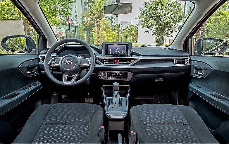 Ở ngoại thất, mẫu xe cỡ A có không gian nội thất thiết kế hoàn toàn mới. Toyota gây ấn tượng khi tạo ra điểm nhấn hiện đại cho cabin nhờ các mảng ốp mạ crôm trên vô-lăng ba chấu, bảng táp-lô. Màn hình giải trí 7 inch đặt nổi, hỗ trợ kết nối Apple CarPlay/Android Auto cho các chức năng giải trí.