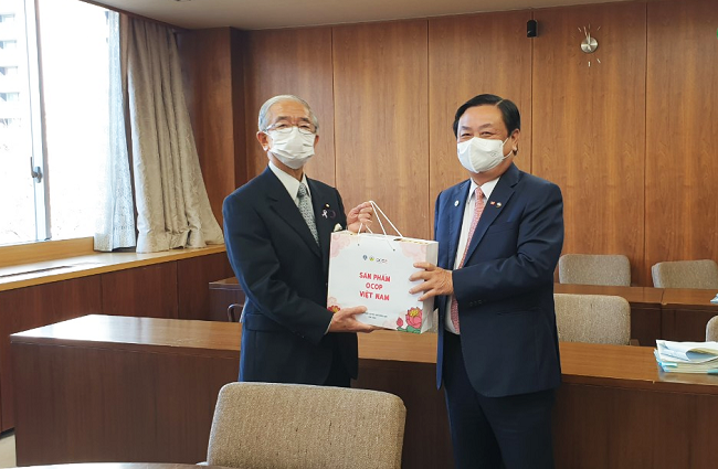 | Bộ trưởng Bộ NN&PTNT Lê Minh Hoan tặng quà OCOP Quốc gia Bộ trưởng Bộ Nông Lâm Ngư nghiệp - Kaneko Genjiro trong chuyến thăm, làm việc tại Nhật Bản |