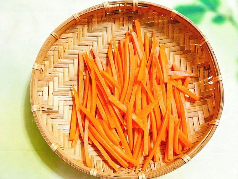 Cà rốt mua về gọt bỏ vỏ, rửa sạch rồi dùng dao bào, bào thành những sợi mỏng dài. Nếu không có dao bào thì bạn vẫn có thể dùng dao cắt thành sợi mỏng
