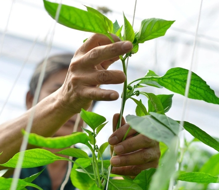 | Ông Thủy đang chăm sóc ớt Sweet Palermo |