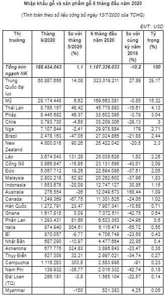 Trong 6 tháng đầu năm 2020 nhập khẩu gỗ và sản phẩm gỗ từ đa số thị trường bị sụt giảm kim ngạch so với cùng kỳ năm 2019; trong đó nhập khẩu từ Campuchia giảm mạnh nhất 91%, chỉ đạt 2,58 triệu USD. Ngoài ra, nhập khẩu cũng giảm mạnh từ các thị trường Italia giảm 55,7%, đạt 6,12 triệu USD; Công Gô giảm 43%, đạt 23,13 triệu USD.