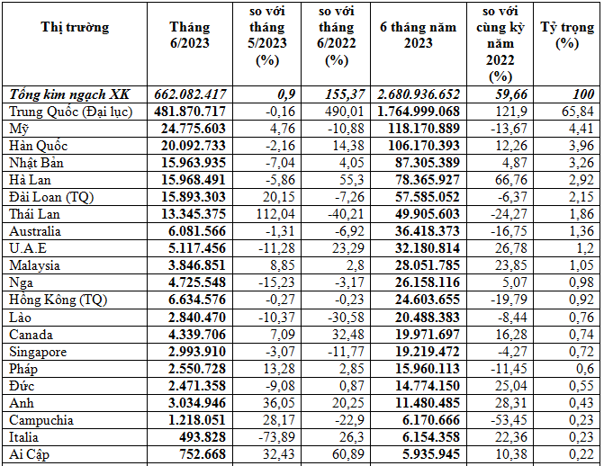 Trung Quốc vẫn là thị trường chính của rau quả Việt Nam xuất khẩu, chiếm 65,8% trong tổng kim ngạch xuất khẩu rau quả của cả nước. 6 tháng năm 2023, xuất khẩu rau quả sang thị trường này đạt trên 1,76 tỷ USD, tăng 121,9% so với cùng kỳ năm 2022; riêng tháng 6/2023 xuất khẩu sang thị trường này đạt 481,87 triệu USD, giảm 0,2% so với tháng 5/2023 nhưng tăng 490% so với tháng 6/2022.