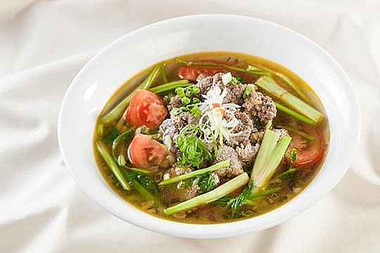 Khi nước dùng sôi lại thì cho 3 muỗng mẻ. Nêm nếm vừa vị rồi cho rau cần, thịt cua đóng váng vào đun sôi bật lên thì nêm hành lá, múc ra tô. Trang trí với ớt cắt lát.