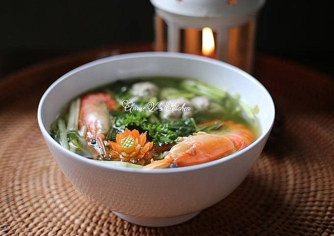 Phi thơm hành tím, xào cà chua sơ qua với gia vị (muối, đường), rồi đổ 1,2 lít nước vào đun sôi. Nêm muối, hạt nêm heo vừa ăn. Cho 3 con tôm và viên tôm vào nấu chín. Khi tôm nổi lên thì cho rau cần vào đun lửa to cho tái là thêm chút nước mắm cho thơm đậm, múc rau ra tô ngay (không để lại trong nồi vì rau sẽ bị nhũn), rắc hành lá, tiêu và ăn nóng.