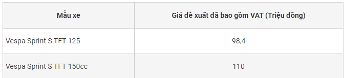 Hiện tại Vespa Sprint S TFT có giá bán đề xuất tại các hệ thống Đại lý ủy quyền của Piaggio Việt Nam như sau: