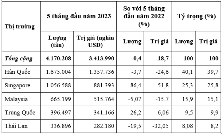 Tiếp sau là thị trường Singapore, chiếm hơn 25% trong tổng lượng và kim ngạch nhập khẩu trong 5 tháng đầu năm 2023, đạt 1.056.588 tấn, trị giá 881,3 triệu USD, tăng 86,4% về lượng và tăng 51,8% về kim ngạch; riêng tháng 5/2023 nhập khẩu đạt 230.929 tấn, trị giá 176,5 triệu USD, tăng 12% về lượng và tăng 7,6% về trị giá.