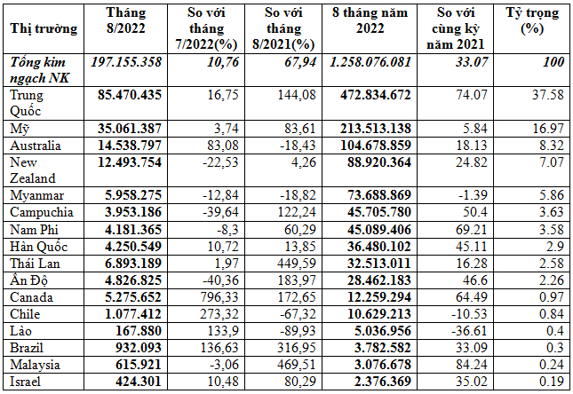 Nhập khẩu rau quả 8 tháng năm 2022