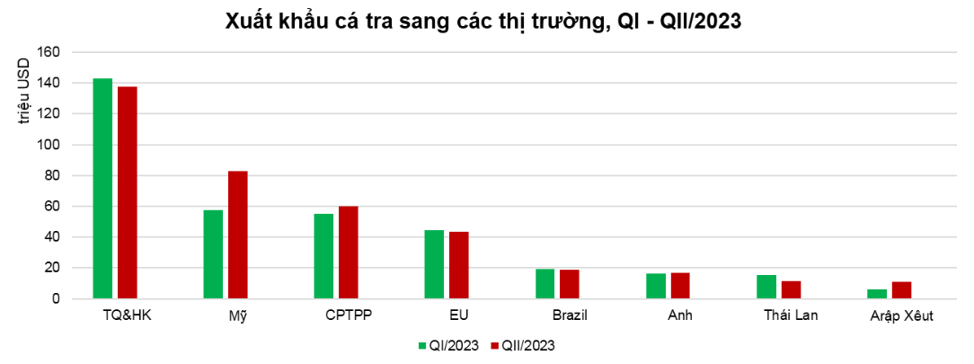 Theo Hiệp hội Chế biến và Xuất khẩu Thủy sản Việt Nam (VASEP), xuất khẩu cá tra 6 tháng đầu năm 2023 đạt 873 triệu USD, giảm 39% so với cùng kỳ năm ngoái. Trong đó, giá trị xuất khẩu sang hầu hết các thị trường đều giảm: Trung Quốc – Hong Kong giảm 34%; Mỹ giảm 61%; CPTPP giảm 36%; Mexico giảm 49%; Brazil giảm 23%...