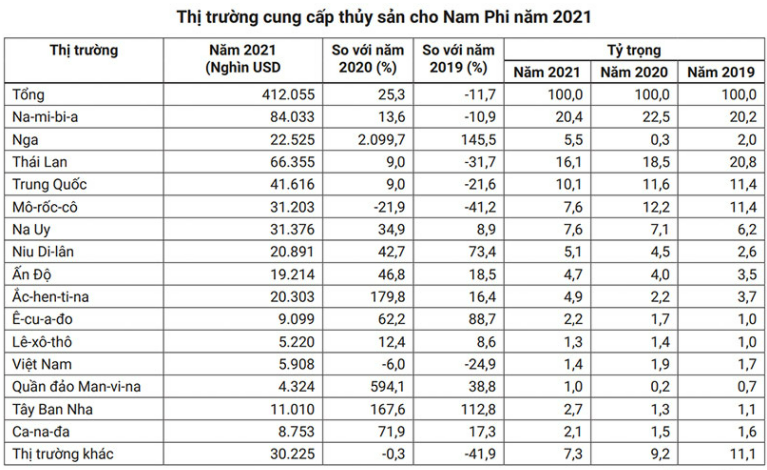 | Danh sách các thị trường cung cấp thủy sản cho Nam Phi trong năm 2021. |
