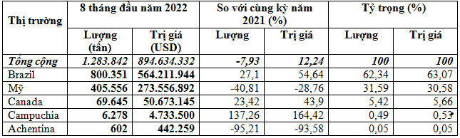 ưTính chung cả 8 tháng năm 2022, nhập khẩu từ thị trường này đạt 405.556 tấn, tương đương 273,56 triệu USD, giá 674,5 USD/tấn, chiếm 31% trong tổng lượng và kim ngạch nhập khẩu đậu tương của cả nước, giảm mạnh 40,8% về lượng, giảm 28,8% về kim ngạch nhưng giá tăng 20,4% so với cùng kỳ năm trước.