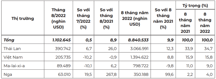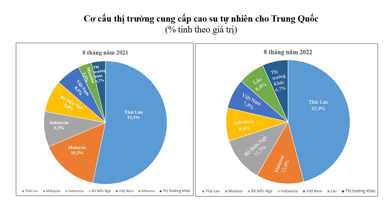 Trong kỳ, Việt Nam là thị trường cung cấp cao su lớn thứ hai cho Trung Quốc với 1,39 tỷ USD, tăng 8,8% so với cùng kỳ năm 2021. Thị phần cao su Việt Nam trong tổng trị giá nhập khẩu của Trung Quốc trong 8 tháng năm 2022 chiếm 15,8%, thấp hơn so với mức 15,9% của 8 tháng đầu năm 2021.