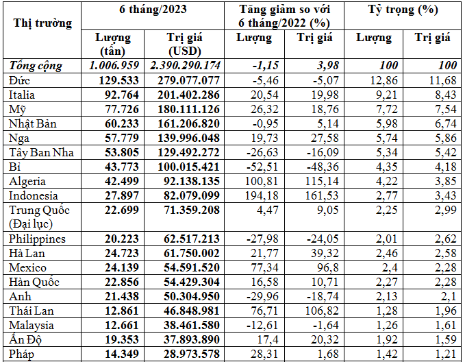 Cà phê của Việt Nam xuất khẩu nhiều nhất sang thị trường Đức trong 6 tháng năm 2023, chiếm 12,9% trong tổng lượng và chiếm 11,7% trong tổng kim ngạch xuất khẩu cà phê của cả nước, đạt 129.533 tấn, tương đương 279,08 triệu USD, giá 2.154,5 USD/tấn, giảm 5,5% về lượng, giảm 5,1% về kim ngạch nhưng tăng 0,4% về giá so với 6 tháng năm 2022; riêng tháng 6/2023 xuất khẩu đạt 15.464 tấn, tương đương 38,86 triệu USD, tăng 4,1% về lượng, tăng 10,8% kim ngạch so với tháng 5/2023.